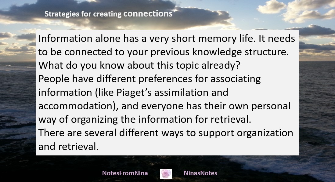 Information alone has a very short memory life. It needs to be connected to your previous knowledge structure. People have different preferences for associating information (like Piaget’s assimilation and accommodation), and everyone has their own personal way of organizing the information for retrieval. There are several ways to support organization and retrieval.