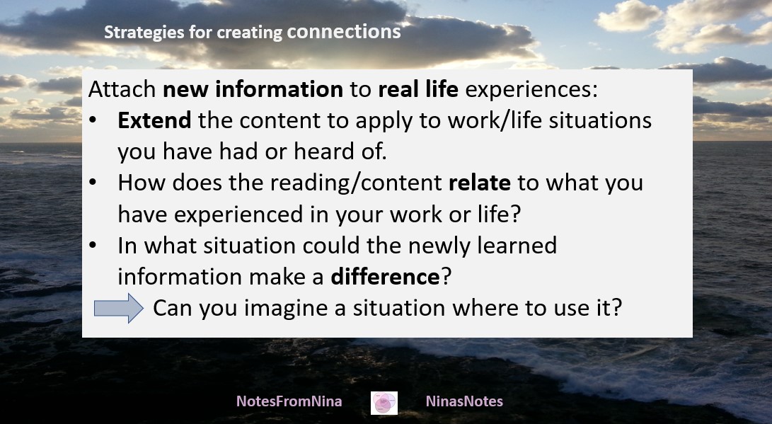 - Attach new information to real life experiences – extend the content to apply to work/life situations you have had. How does the reading relate to what you have experienced in your work or life? In what situation could the newly learned information make a difference?