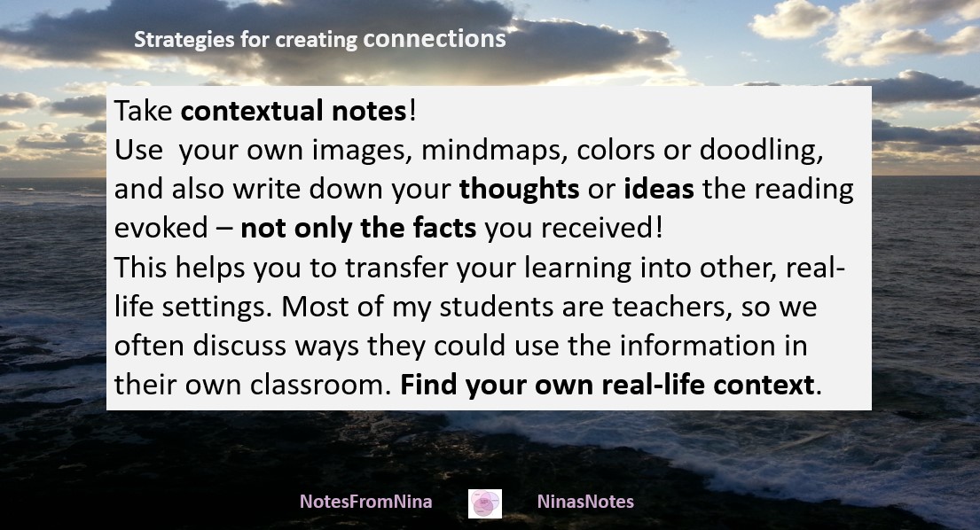 - Take contextual notes – use images, mindmaps or doodling, and also write down your thoughts or ideas the reading evoked. This helps you to transfer your learning into other settings.