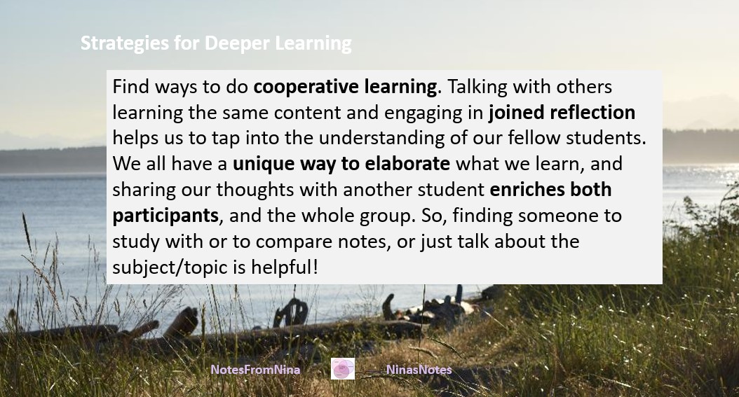 - Find ways to do cooperative learning. Talking with others learning the same content and engaging in joined reflection helps us to tap into the understanding of our fellow students. We all have a unique way to elaborate what we learn, and sharing our thoughts with another student enriches both participants, and the whole group. So, finding someone to study with or to compare notes, or just talk about the subject/topic is helpful.