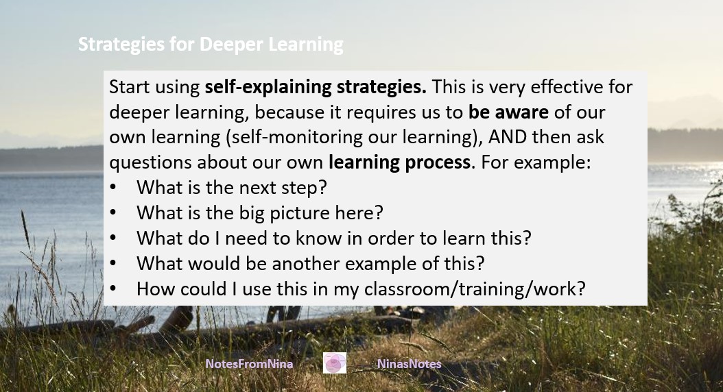 - Start using self-explaining strategies. This is very effective for deeper learning, because it requires us to be aware of our own learning (self-monitoring our learning), AND then ask questions about our own learning process. For example: