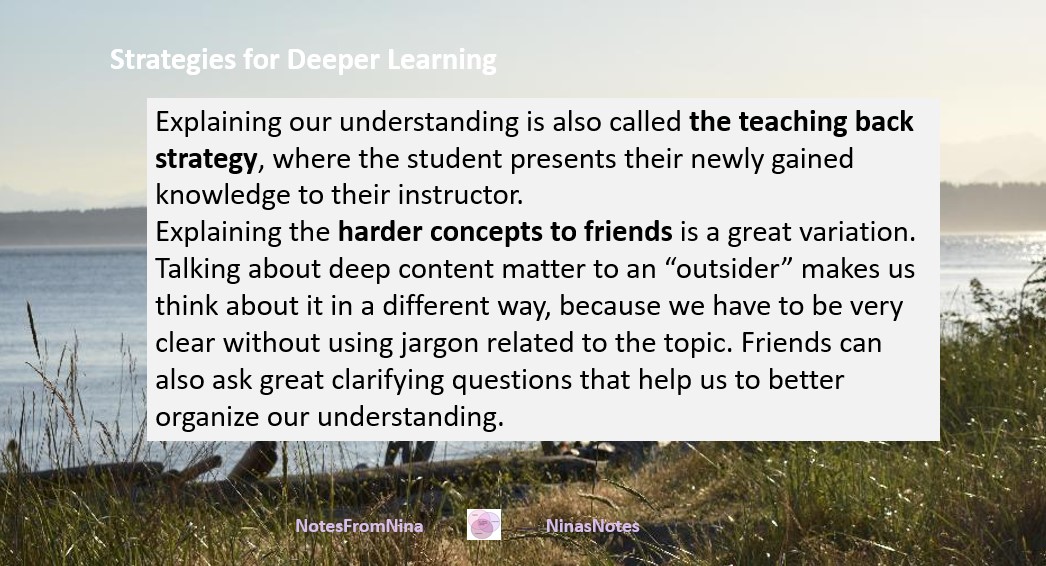 - Explaining the harder concepts to friends is a great variation. Talking about deep content matter to an “outsider” makes us think about it in a different way, because we have to be very clear without using jargon related to the topic.