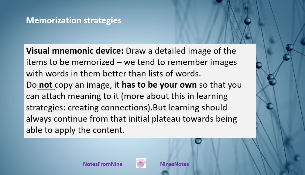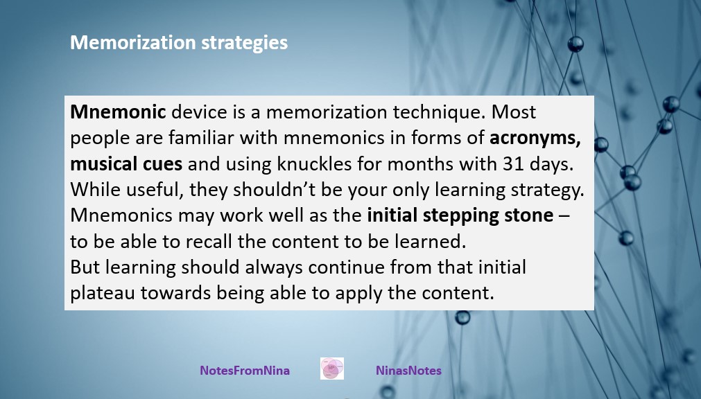 - Use mnemonics as a memorization technique. Most people are familiar with mnemonics, but they shouldn’t be your only learning strategy. Sometimes mnemonics work well as the initial stepping stone – to be able to recall the content to be learned. But learning should always continue from that initial plateau towards being able to apply the content.