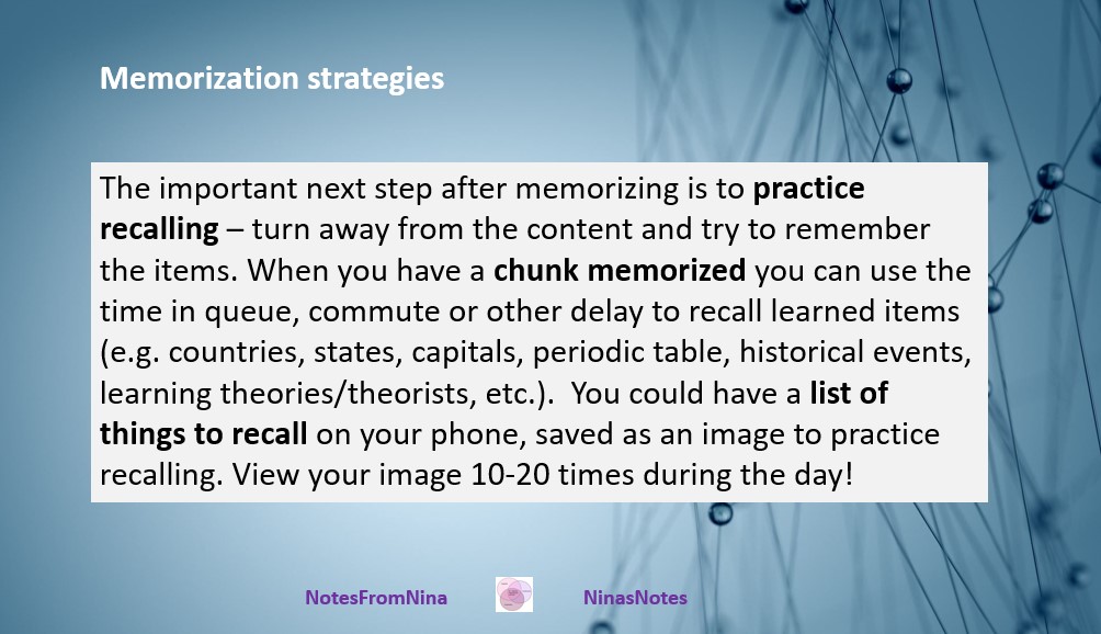 - The important second step is to practice recalling things – turn away and try to remember the items. When you have a chunk memorized you can use the time in queue, commute or other delay to recall learned items (e.g. countries, states, capitals, periodic table, historical events, learning theories/theorists, etc.).