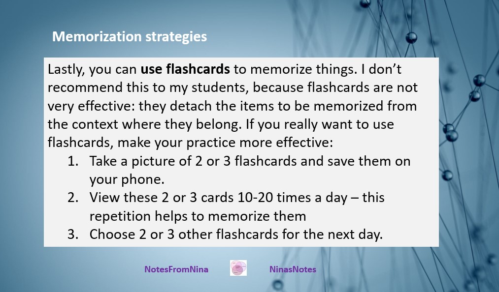 - And, lastly, you can also use flashcards to initially memorize things. Often flashcards are not very effective, because they detach the items to be memorized from the context where they belong. If you really want to use flashcards, make your practice more effective: