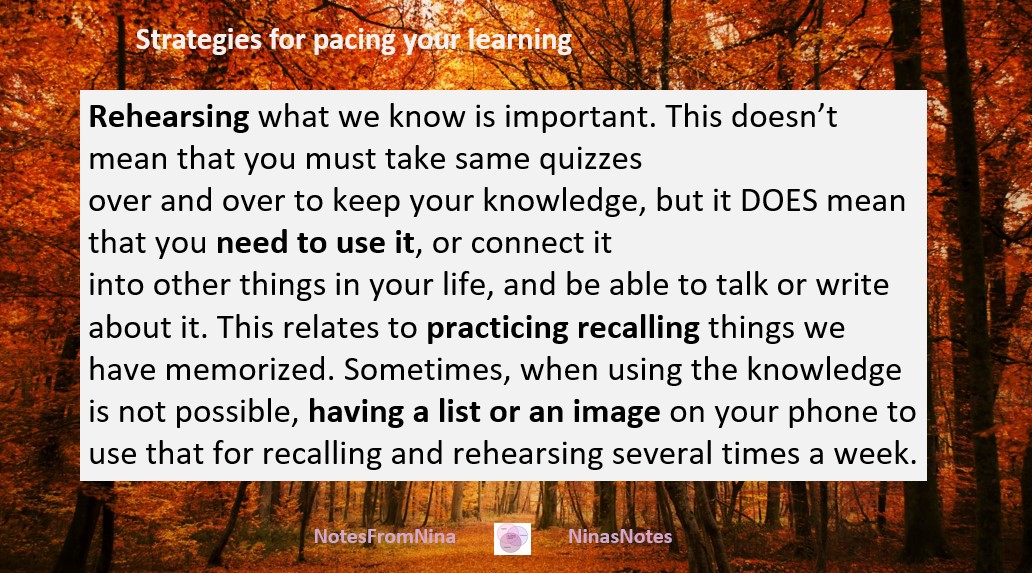 - Rehearsing what we know is important. This doesn’t mean that you must take same quizzes over and over to keep your knowledge, but it DOES mean that you need to use it, or connect it into other things in your life, and be able to talk or write about it.