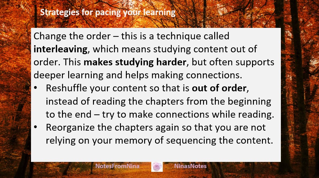 - Change the order – this is a technique called interleaving, which means studying content out of order. This makes studying harder, but often supports deeper learning.